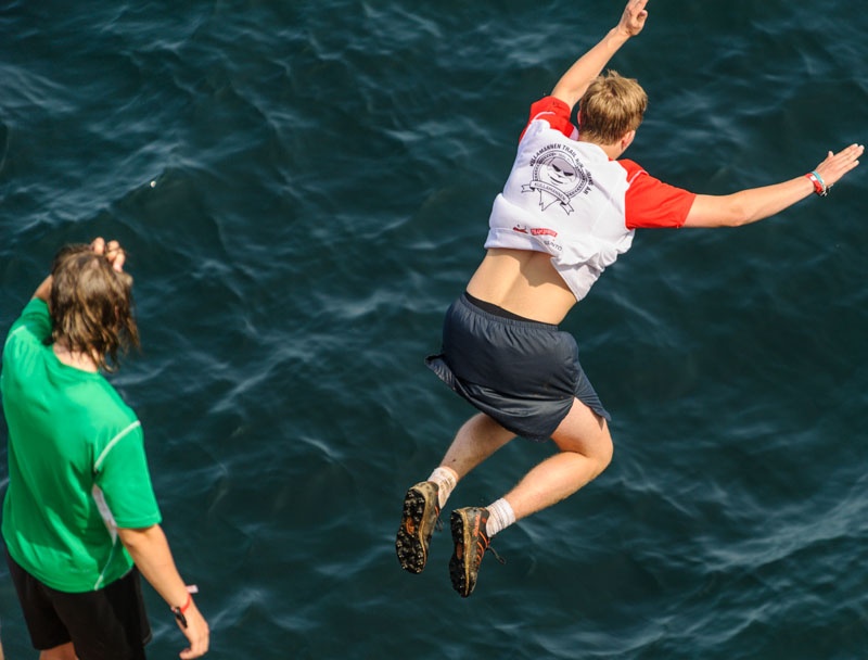 Mindre klipphopp från 5-10m kan förekomma även passager med simning längs klippor och strömmar.